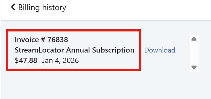 Log in to your account on any web browser at account.streamlocator.com. You will immediately see the account status. If you click My Subscription, then Billing History, you will see when the next payment is due.