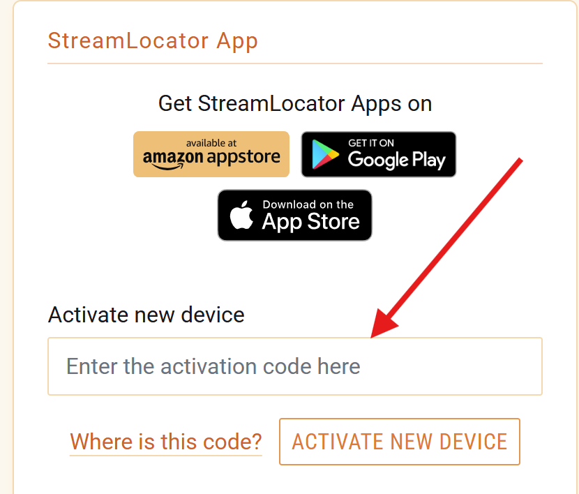 In any web browser, log in to your StreamLocator account at account.streamlocator.com, scroll to the bottom of the page, enter the Activation code in the box, and click Activate New Device.